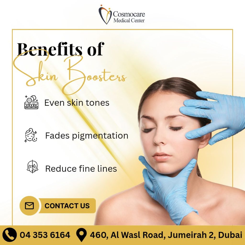 Unlock your skin’s full potential at Cosmocare Medical Center! Our premium Skin Booster treatments are designed to revitalize your complexion by providing deep hydration and essential nutrients. Experience the incredible benefits as they work to create even skin tones, effectively fade pigmentation, and visibly reduce fine lines. Whether you’re looking to refresh your look or maintain a youthful radiance, our expert team in Jumeirah is here to help you achieve smooth, glowing skin. Start your journey toward a more confident, luminous you today!