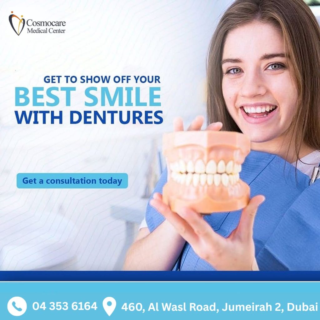 Missing teeth shouldn’t hold you back from living your best life. At Cosmocare Medical Center, we specialize in high-quality dentures designed to look natural, feel comfortable, and restore your ability to eat and speak with ease. Our expert team provides personalized care to ensure your new smile fits your face and personality perfectly. Why wait to feel like yourself again? Take the first step toward a functional, beautiful smile that you’ll be proud to show off. Get to show off your best smile with dentures—book your consultation at our Jumeirah clinic today!