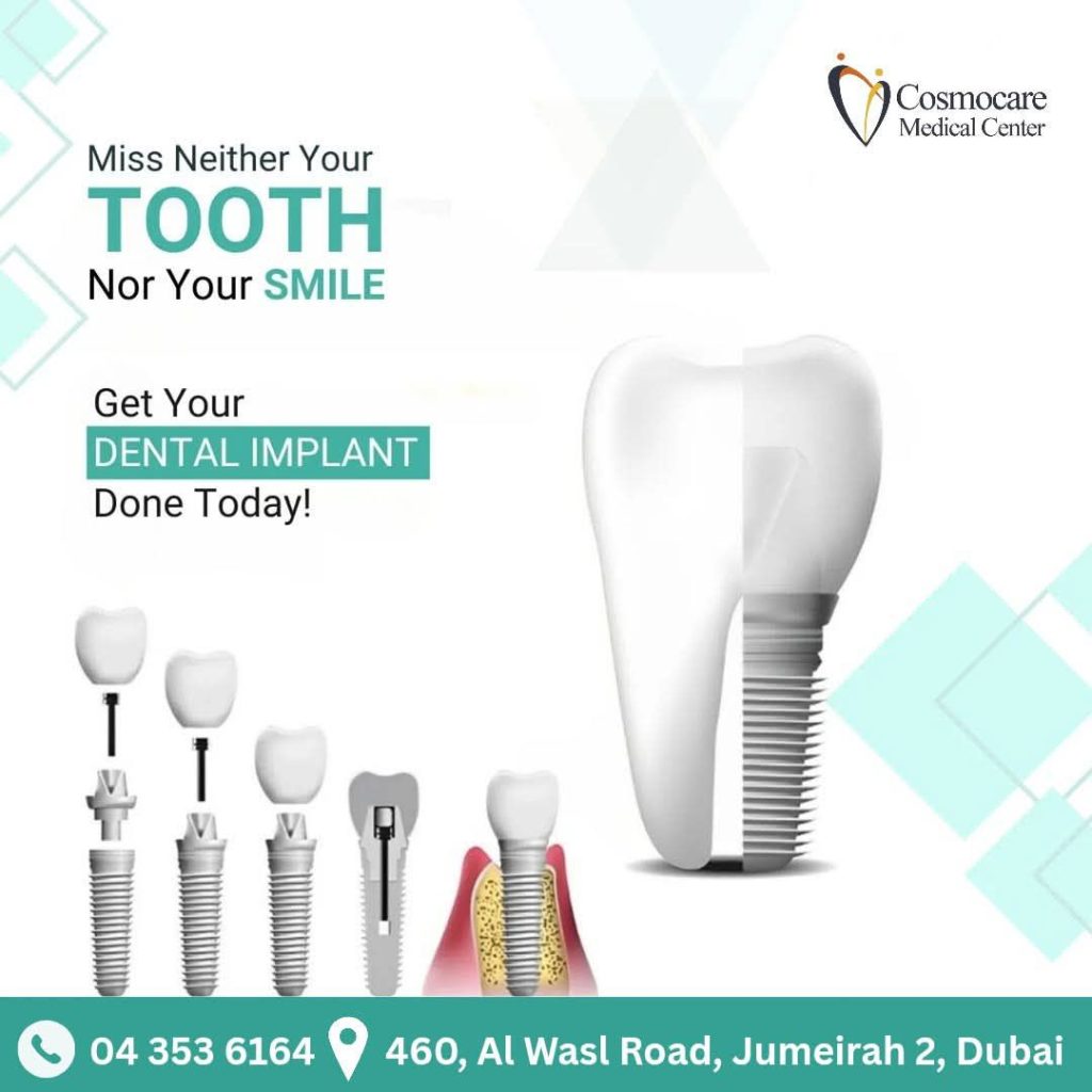 Don’t let a missing tooth hold you back from smiling your brightest. At Cosmocare Medical Center, we specialize in high-quality dental implants designed to look, feel, and function just like your natural teeth. Whether you’re looking to improve your chewing ability or simply want to boost your self-esteem, our expert team in the heart of Jumeirah is here to provide seamless, long-lasting results.