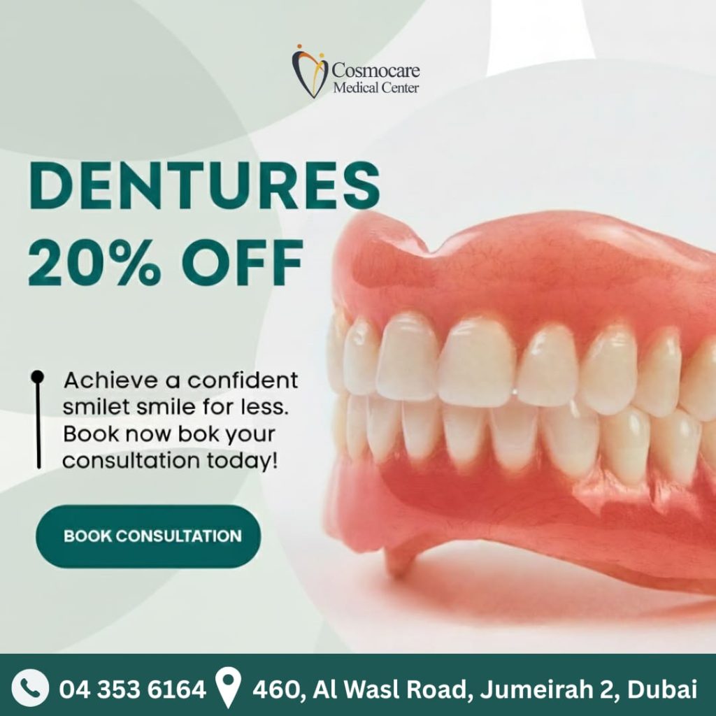 Tired of hiding your smile? Cosmocare Medical Center is here to help you regain your confidence with our high-quality dentures! For a limited time, get 20% OFF your dentures treatment. We use the latest technology to ensure a comfortable and natural-looking fit. Don’t let missing teeth hold you back any longer. Achieve that beautiful, confident smile you deserve at an unbeatable value. Book your consultation today and take the first step towards a brighter, more confident you!