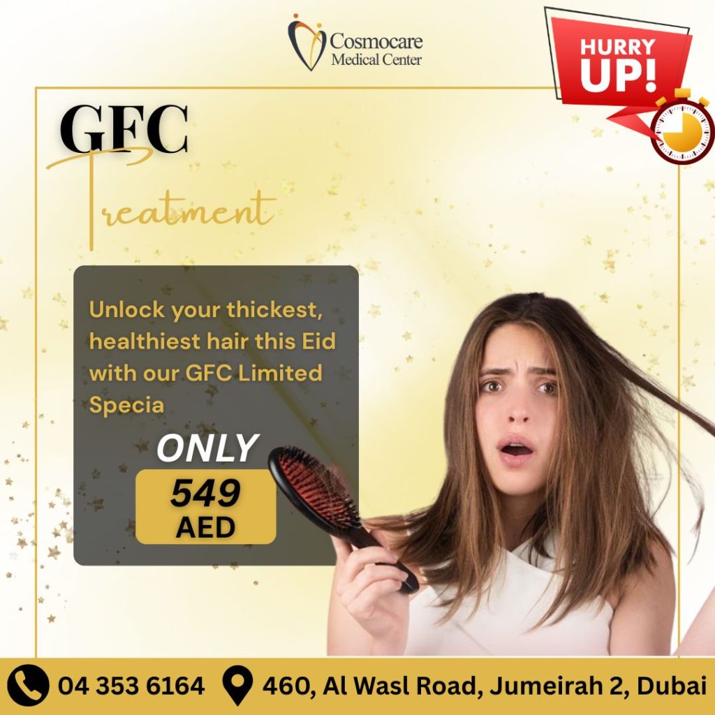 Unlock your thickest, healthiest hair this Eid at Cosmocare Medical Center! If you’re struggling with thinning or dull hair, our specialized GFC (Growth Factor Concentrate) Treatment is the advanced solution you’ve been waiting for.