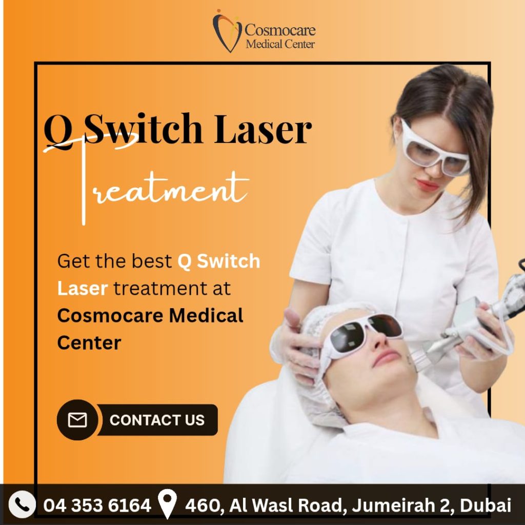 Get the best Q Switch Laser treatment right here at Cosmocare Medical Center! This revolutionary non-invasive procedure effectively targets and reduces pigmentation, sun spots, freckles, and acne scars. It also revitalizes your skin by stimulating collagen production, giving you a smooth and radiant complexion. Trust our expert dermatologists in Dubai for safe, effective, and customized skin solutions. Say goodbye to blemishes and hello to confidence—contact us now to book your consultation!