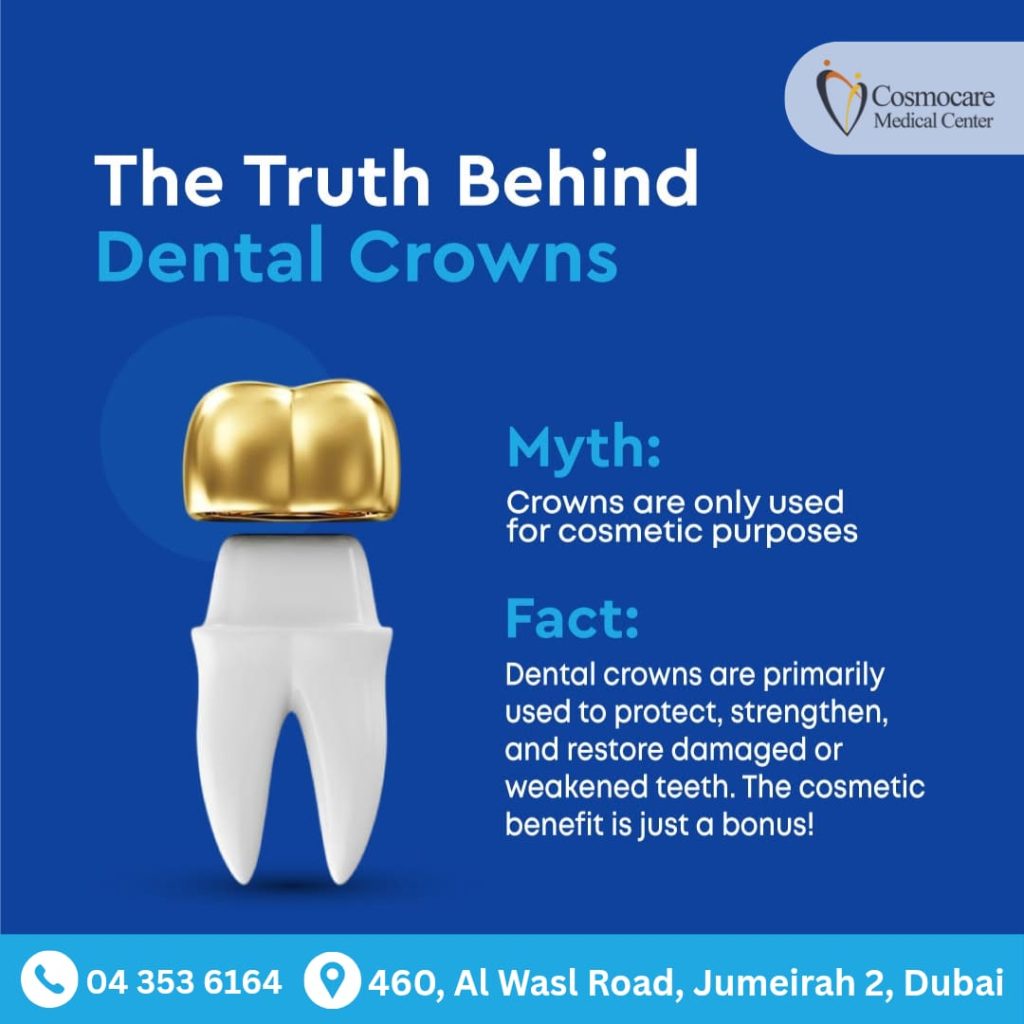 Fact: At Cosmocare Medical Center, we use dental crowns primarily to protect, strengthen, and restore damaged or weakened teeth. Think of them as a protective cap that keeps your natural tooth safe and functional! The amazing cosmetic improvement is just the bonus of having a healthier smile.