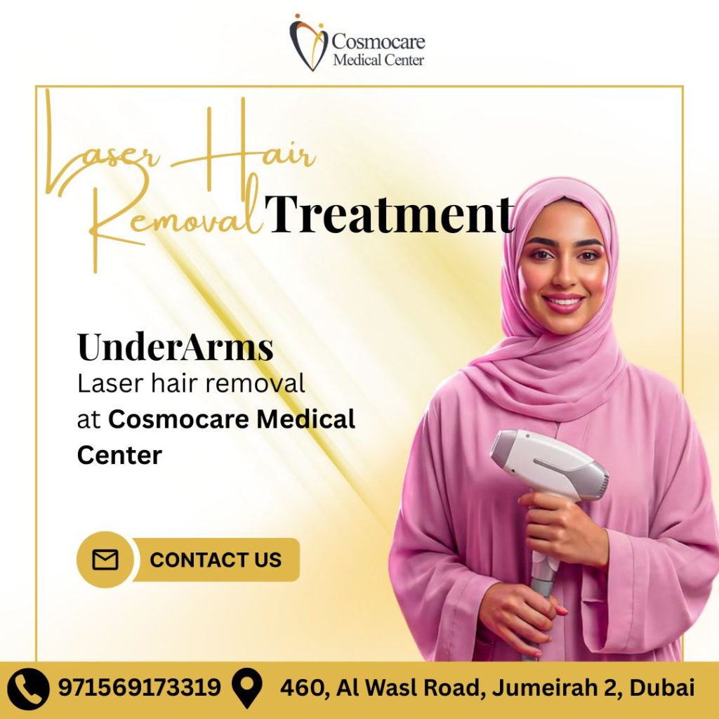 Say goodbye to the daily hassle of shaving and the pain of waxing! At Cosmocare Medical Center, we offer advanced Laser Hair Removal specifically designed for sensitive areas like underarms. Experience long-lasting results and the freedom of smooth, hair-free skin with our safe and effective technology. Our expert team ensures a comfortable, professional environment, helping you feel confident and refreshed in every outfit. Whether itβs for a special occasion or your daily routine, it’s time to invest in your comfort. Book your session today at our Jumeirah clinic and discover the luxury of effortless beauty!