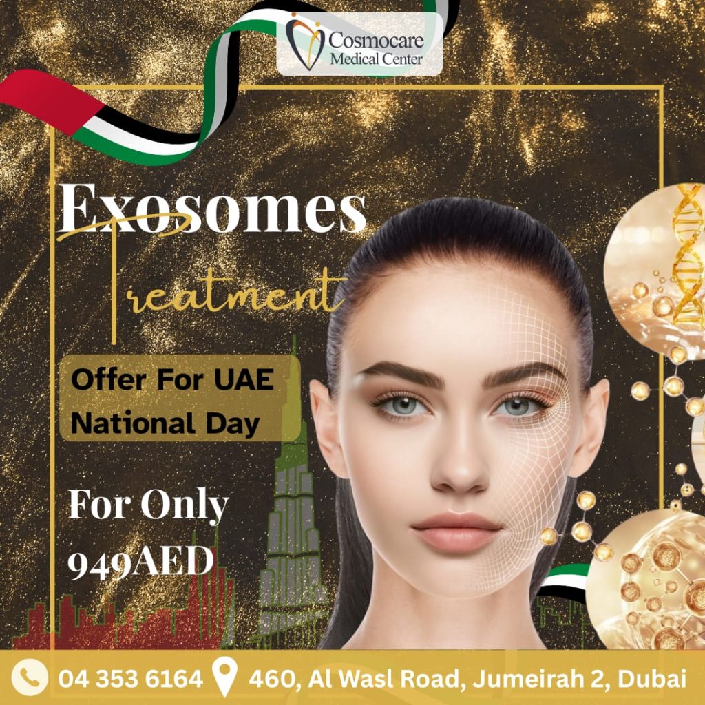Celebrate UAE National Day with cutting-edge skincare! Experience the power of Exosomes Treatment, a revolutionary therapy that promotes intense skin regeneration, boosts collagen, and dramatically improves texture and tone. Exosomes are packed with growth factors that repair and revitalize your skin from a cellular level. For this special occasion, receive this advanced treatment for ONLY 949 AED at Cosmocare Medical Center. Unlock your skin’s full potential and step into the holiday with a flawless, radiant complexion. Book your session today!