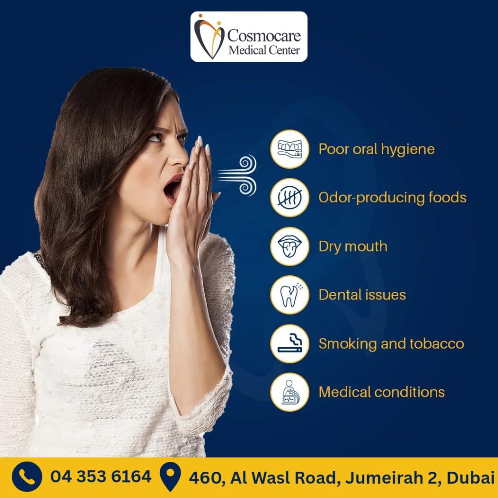 Is bad breath holding you back? Don’t let it! Understanding the cause is the first step to a fresher smile. As the image shows, factors ranging from poor oral hygiene and odor-producing foods to dental issues and even medical conditions can all play a role. A fresh start is just an appointment away. Let our experts at Cosmocare Medical Center help you identify the root cause and find the perfect solution for long-lasting freshness! We’re here to help you smile and speak with confidence.
