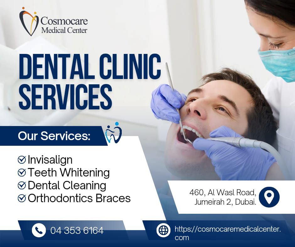 Ready to flash a confident, radiant smile? At Cosmocare Medical Center, we combine expert care with the latest dental technology to give you a reason to grin. Whether you’re looking for the discreet alignment of Invisalign, professional Teeth Whitening for a brighter glow, or a routine Dental Cleaning to keep your oral health in check, our specialist team in Jumeirah is here for you! 🦷✨