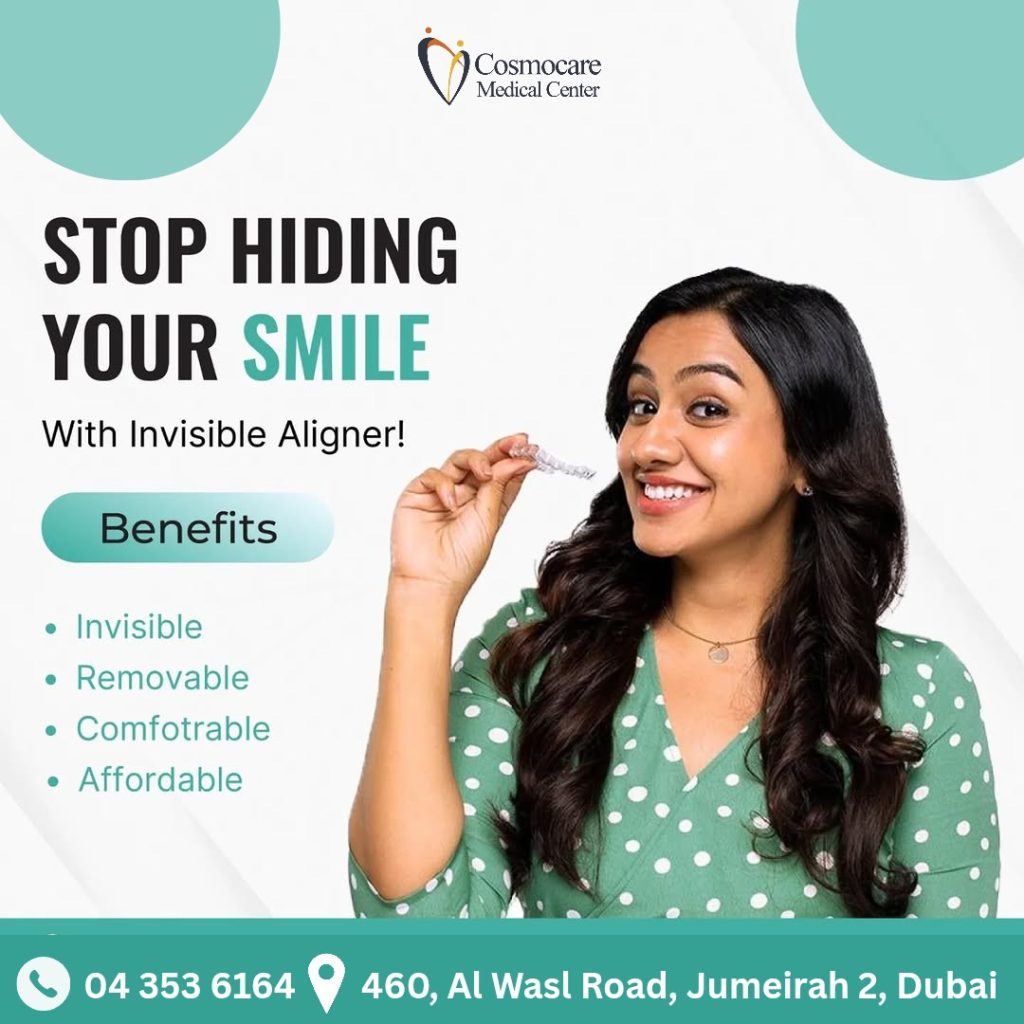 Ready to transform your smile without the hassle of traditional braces? Stop hiding your smile and embrace the clear advantage of Invisible Aligners at Cosmocare Medical Center!