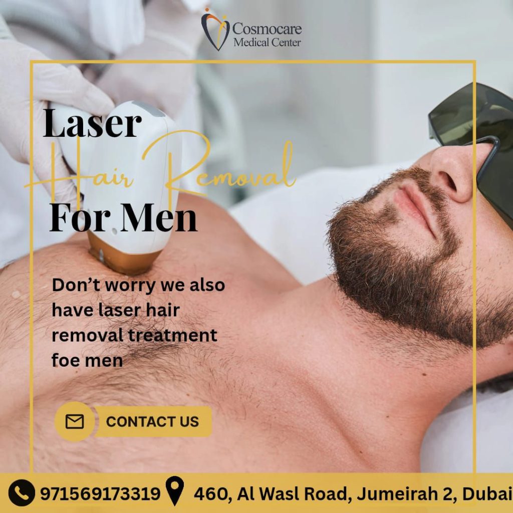 Gentlemen, itโs time to upgrade your grooming routine! At Cosmocare Medical Center, we offer specialized laser hair removal treatments for men designed for comfort and efficiency. Whether you are looking to clear chest hair, back hair, or groom your beard line, our advanced technology provides long-lasting results that save you time and effort. Say goodbye to the irritation of shaving and the pain of waxing. Experience smooth, clean skin with a professional touch right here in Jumeirah. Your journey to effortless grooming starts with us!