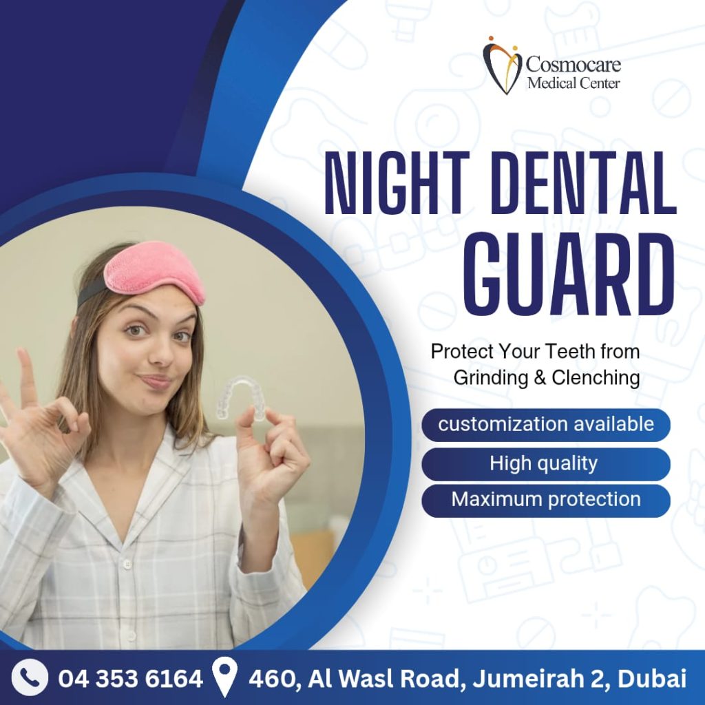 Are you waking up with jaw pain or headaches? You might be grinding or clenching your teeth at night! At Cosmocare Medical Center, we offer Night Dental Guards to protect your teeth and dental work from damage. Get maximum protection with our high-quality, custom-fit guards tailored just for you. Stop the wear and tear and start enjoying peaceful, protected sleep. Don’t let Bruxism damage your beautiful smileโschedule your consultation today for a customized solution!