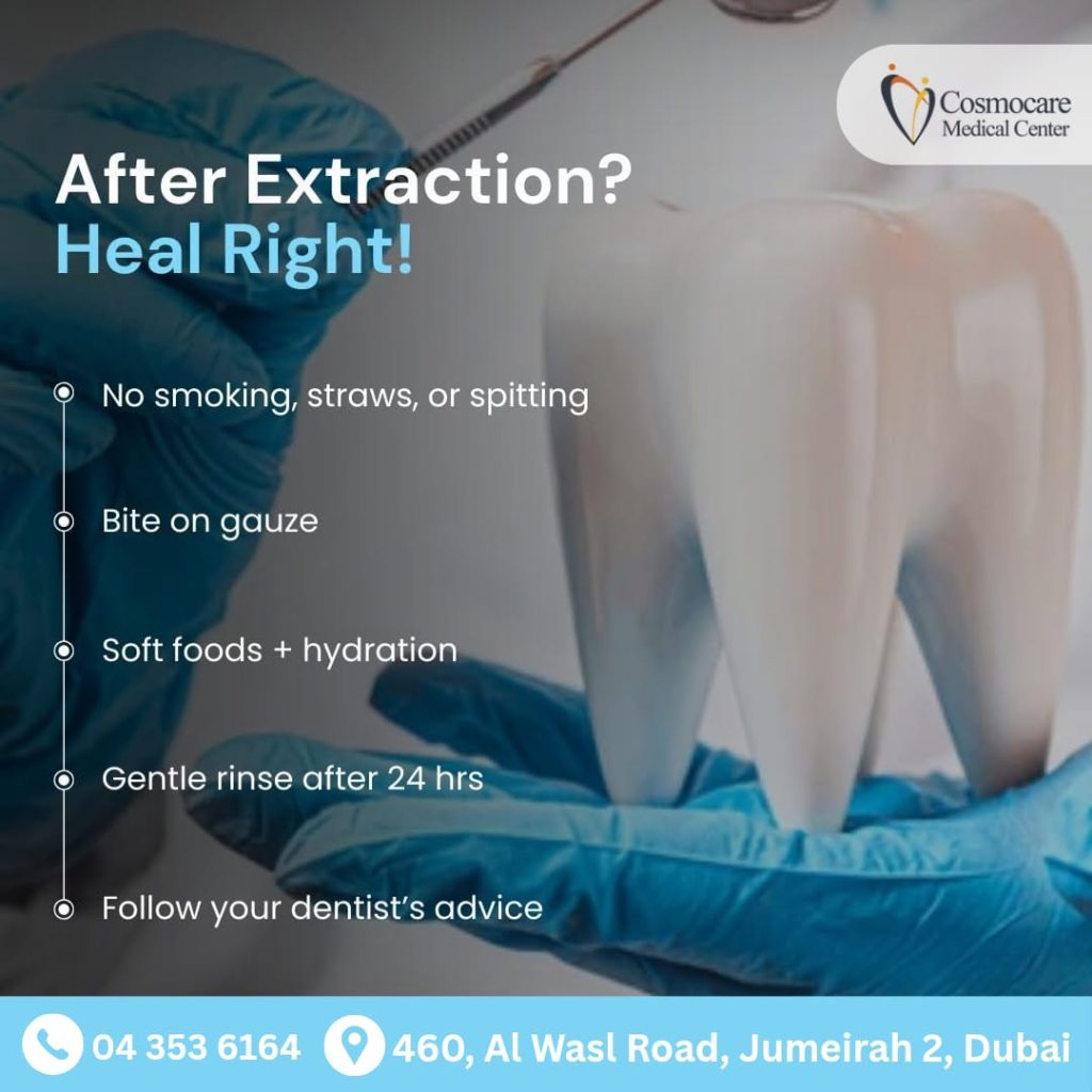 Remember: Avoid straws and smoking, stick to soft foods, and keep yourself hydrated. Your comfort is our priority at Cosmocare Medical Center. Our expert team is here to guide you through every step of your dental journey with gentle care and professional advice.
