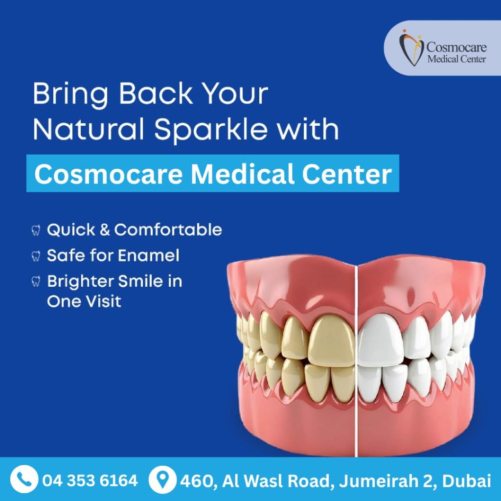 At Cosmocare Medical Center, we make achieving a brilliant smile quick and comfortable. Our professional whitening treatment is safe for your enamel and delivers a noticeably brighter smile in just one visit! Don’t let stains dull your shineโstep into confidence with a radiant, white smile.
