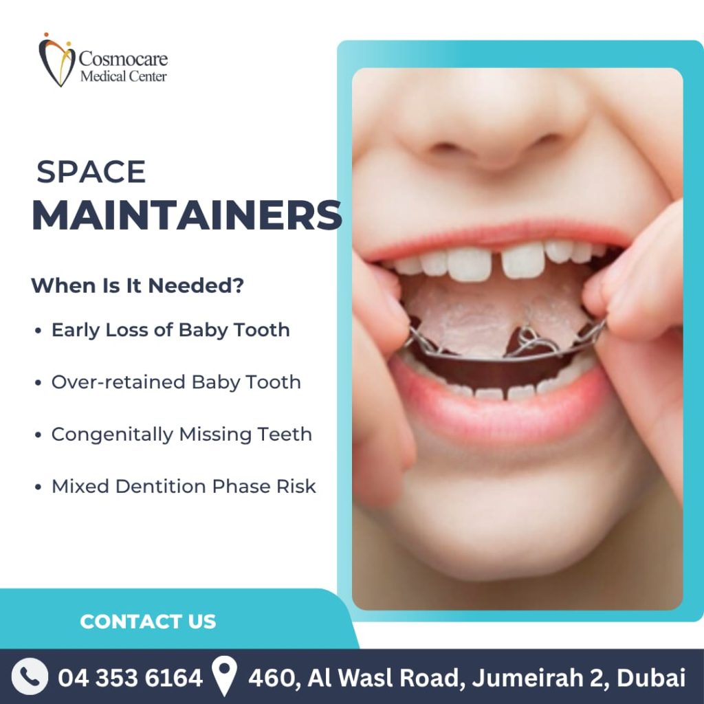 Space maintainers are crucial appliances designed to hold the spot open until the permanent tooth is ready to erupt. This simple, effective treatment prevents drifting and crowding, ensuring a healthy, beautiful smile during the vital mixed dentition phase. Protect your child’s dental future with expert care at Cosmocare Medical Center. Early intervention makes all the difference! Book a consultation today to learn if a space maintainer is the right step for your little one.