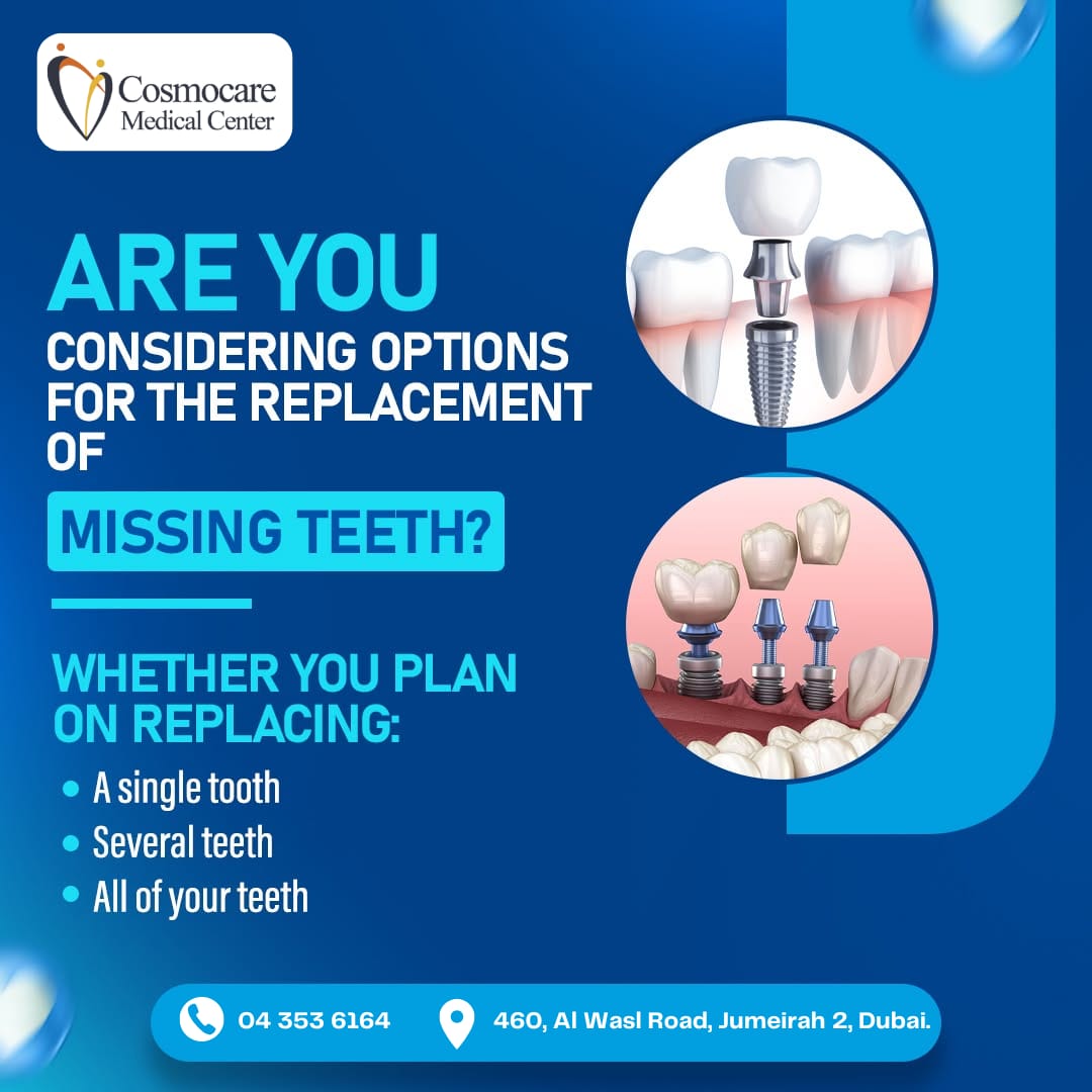 Rediscover Your Complete, Confident Smile! Missing teeth shouldn’t hold you back from smiling, speaking, or eating with confidence! At Cosmocare Medical Center, we offer the most advanced and permanent solutions for tooth replacement. Whether you’ve lost a single tooth, several teeth, or need a full arch restoration, dental implants...