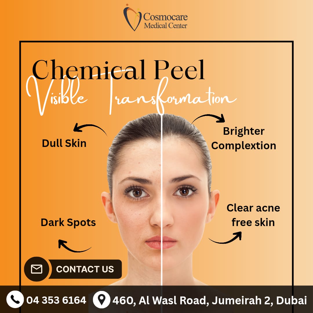Unlock Your Glow with a Chemical Peel Ready for a Visible Transformation? At Cosmocare Medical Center in Dubai, our customized Chemical Peel treatments are the secret to radiant skin. Say goodbye to Dull Skin and Dark Spots, and welcome a Brighter Complexion and Clear, acne-free skin. Chemical peels gently...