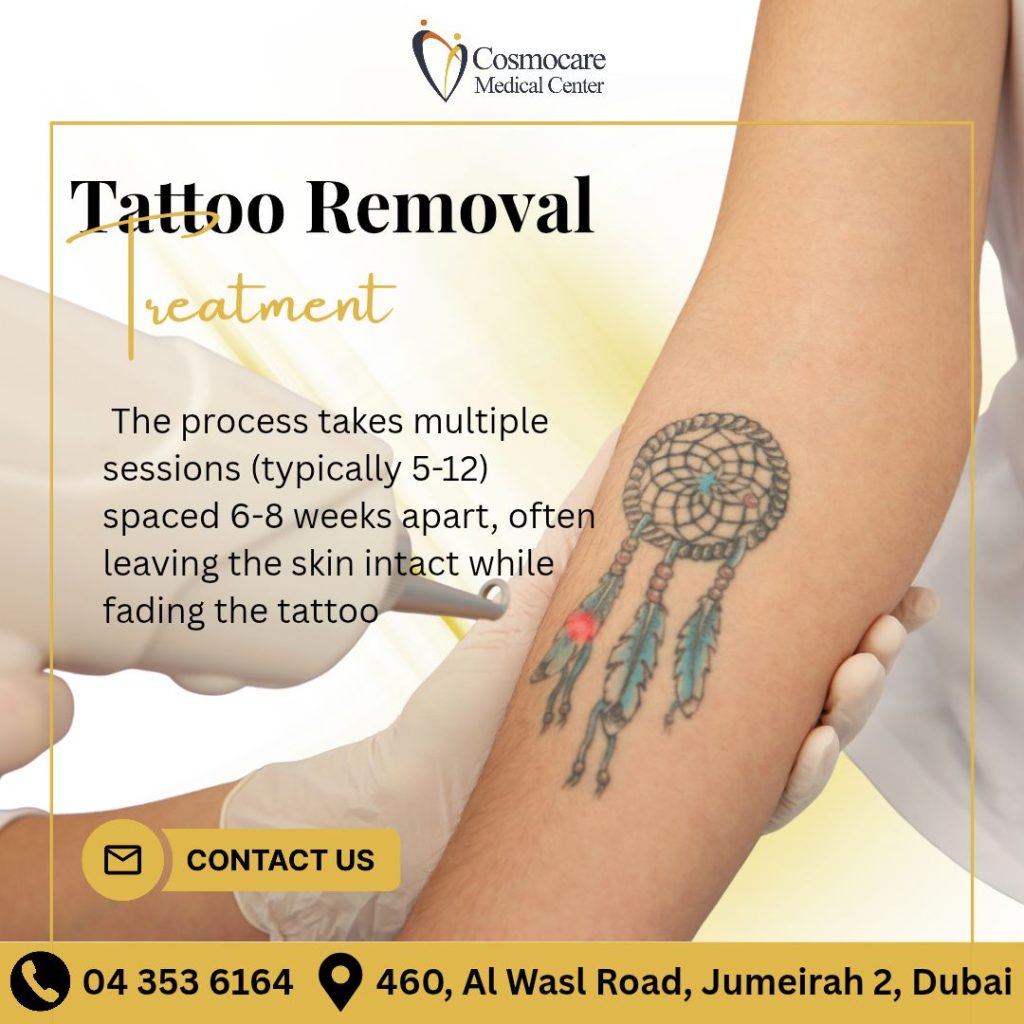 Since tattoo removal is a journey, we provide a clear roadmap: typically 5-12 sessions spaced 6-8 weeks apart for optimal results. Whether you want a complete removal or a significant fade for a cover-up, our expert team in Dubai is here to help you start fresh with confidence!